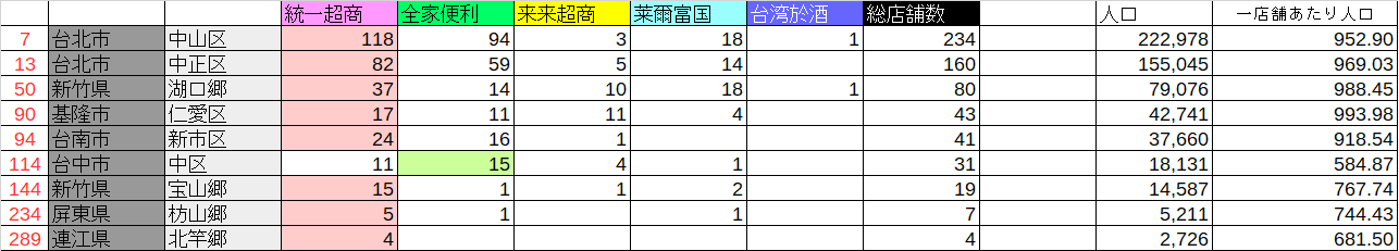 前年度より勢力減に歯止めがかからない来来超商であるが、ついに1位となった地域がなくなった。前年は中正区でかろうじて同率1位だったが、1店舗が閉店し6店舗となり、全家便利の単独1位となったからだ。そして総店舗数でも3位となり、全ての県市(統一単独の連江を除く)で1位2位を2大超商が独占する結果となった。