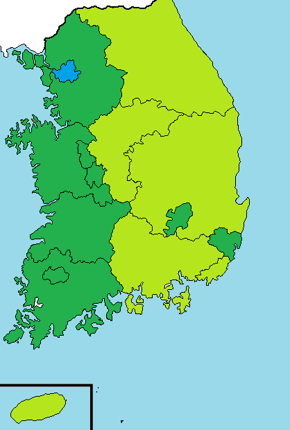 都市部のGS25、郊外のCU(境界線修復が完了。画像出元はhttps://commons.wikimedia.org/wiki/File:Provinces_of_South_Korea.svg(User:Ksiom、CC BY-SA 3.0 非移植)です。この画像の転用(白地図化含む)についてはは同ライセンスで利用可能とします。)